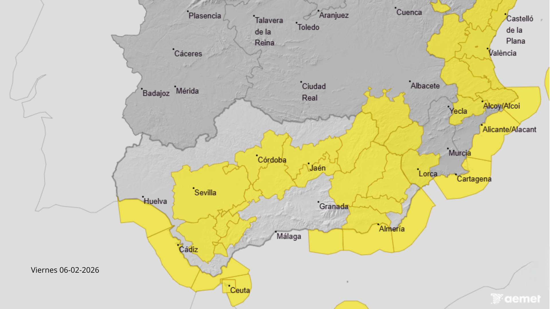 La Aemet ha activado el aviso amarillo por fenómenos costeros en el litoral de Huelva para este viernes, 6 de febrero. La alerta comenzará a las 14:00 horas y se mantendrá hasta la medianoche, afectando especialmente a la navegación y zonas de playa debido a fuertes vientos y oleaje.