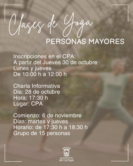 El Ayuntamiento anunció la ampliación de la oferta de actividades del Centro de Participación Activa con la puesta en marcha de nuevas clases de Yoga. La iniciativa, pensada para mejorar la salud y el bienestar de los mayores, será presentada en una Charla Informativa el próximo martes 28 de octubre (17:30h en el CPA). Las inscripciones se abrirán a partir del 30 de octubre.