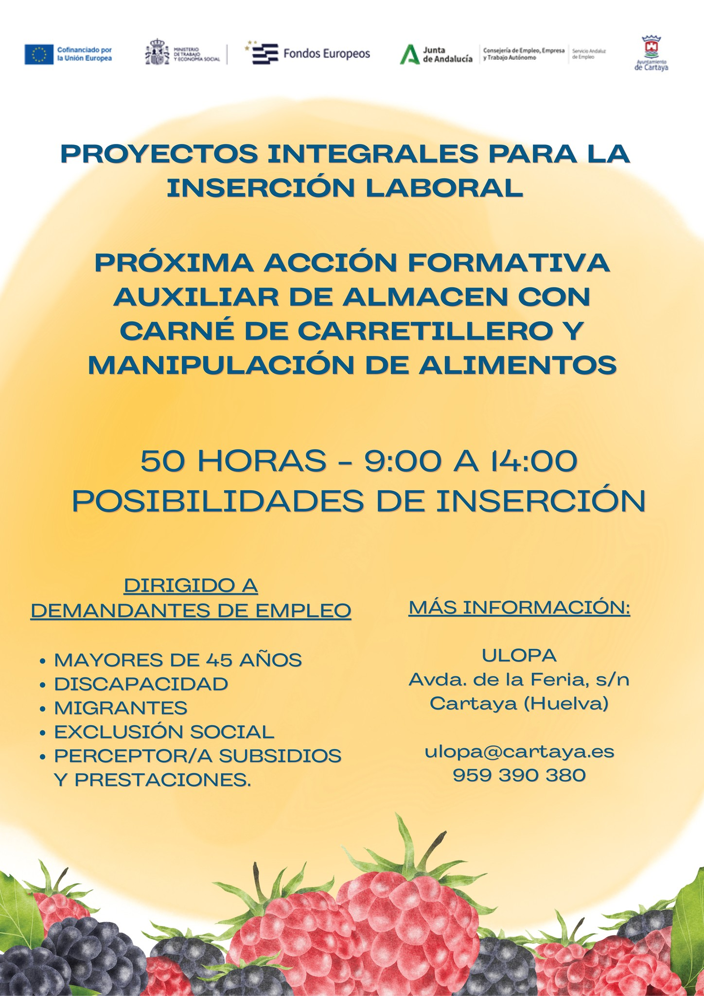 - Curso de Auxiliar de Almacén: Abierto el plazo para una formación de 50 horas que incluye carné de carretilla y manipulador de alimentos. Una acción del programa «T-Acompañamos» destinada a colectivos con dificultad de inserción laboral.