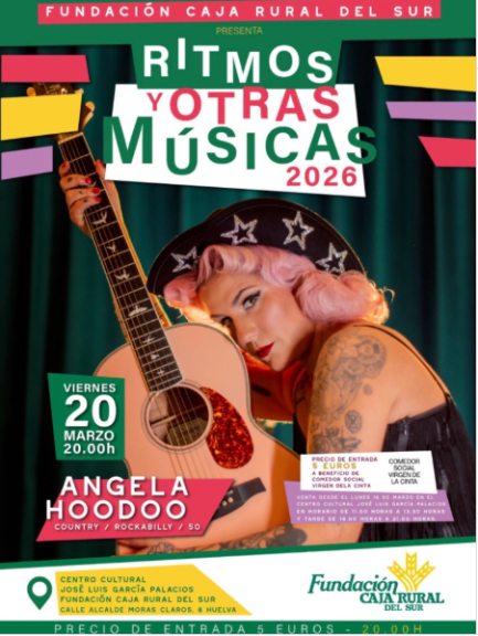 Para los amantes de la música con alma, la Fundación Caja Rural del Sur presenta a Angela Hoodo. Considerada una de las voces más potentes de la música de raíz americana en España, Hoodo mezcla con maestría el country, el folk y el rock con una actitud arrolladora. Además de disfrutar de un directo salvaje y auténtico, asistir tiene un valor añadido: el 100% de la recaudación se destina al Comedor Social Virgen de la Cinta.