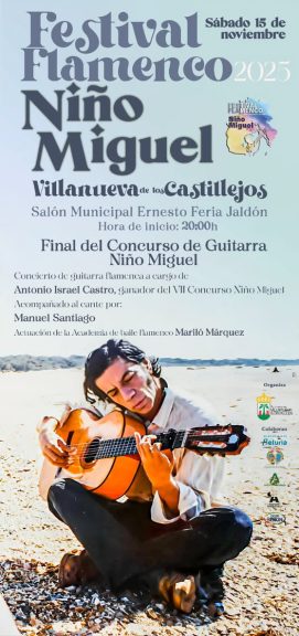 El enfoque principal en la Sierra se centra en Villanueva de los Castillejos, que se prepara para acoger la gran Final del VIII Concurso de Guitarra Flamenca ‘Niño Miguel’ este sábado 15 de noviembre a las 20:00h en el Salón Municipal Ernesto Feria Jaldón.