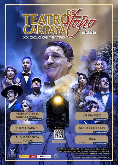 El telón se levantará a las 21:00 horas en el Teatro del Centro Cultural Alcalde Juan Antonio Millán Jaldón con el esperado estreno de la temporada: «Asesinato en el Orient Express», a cargo de la Cía. Saga Producciones. Un clásico de la literatura de intriga que promete una noche de misterio y gran puesta en escena para dar inicio a un ciclo que se extenderá hasta el 28 de noviembre.